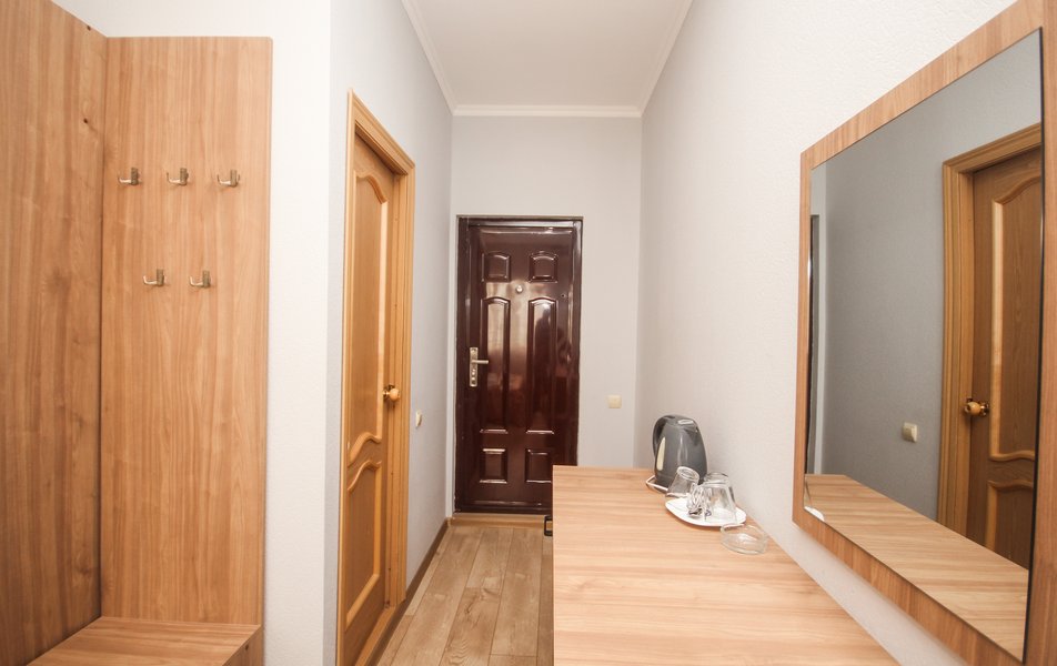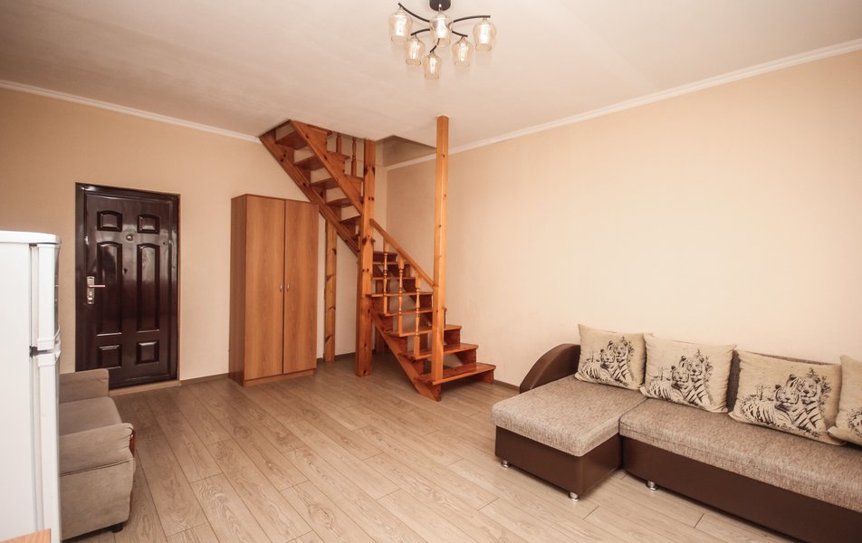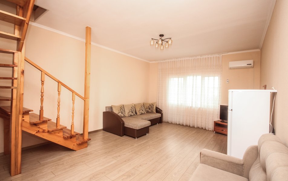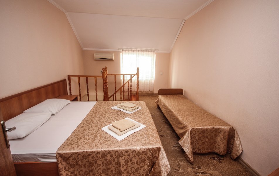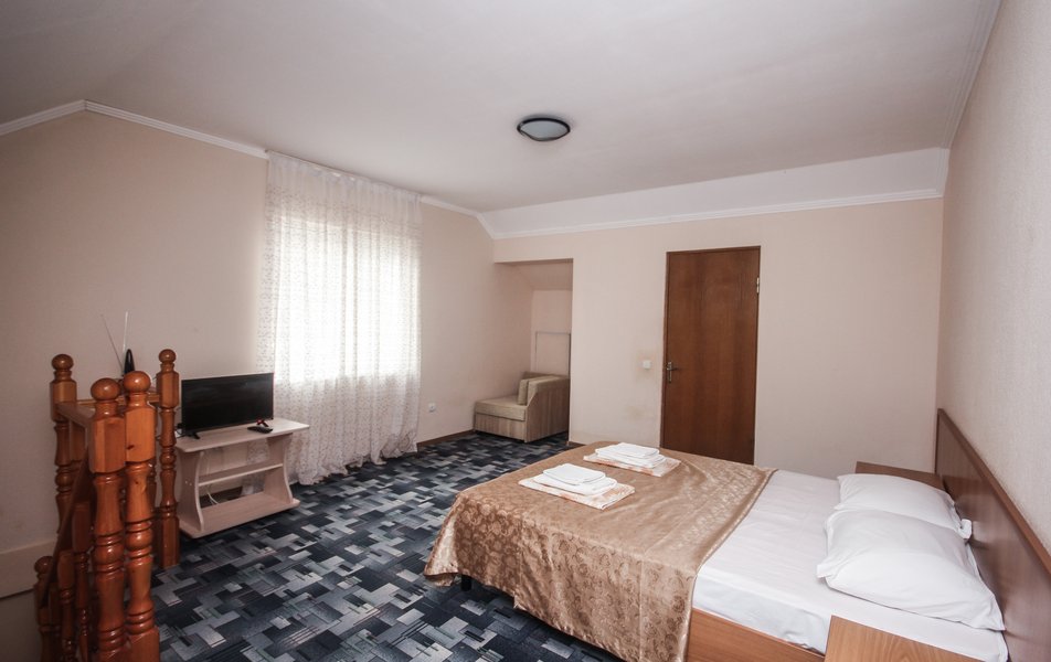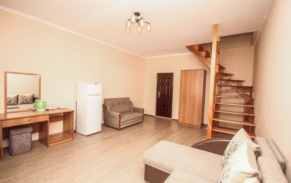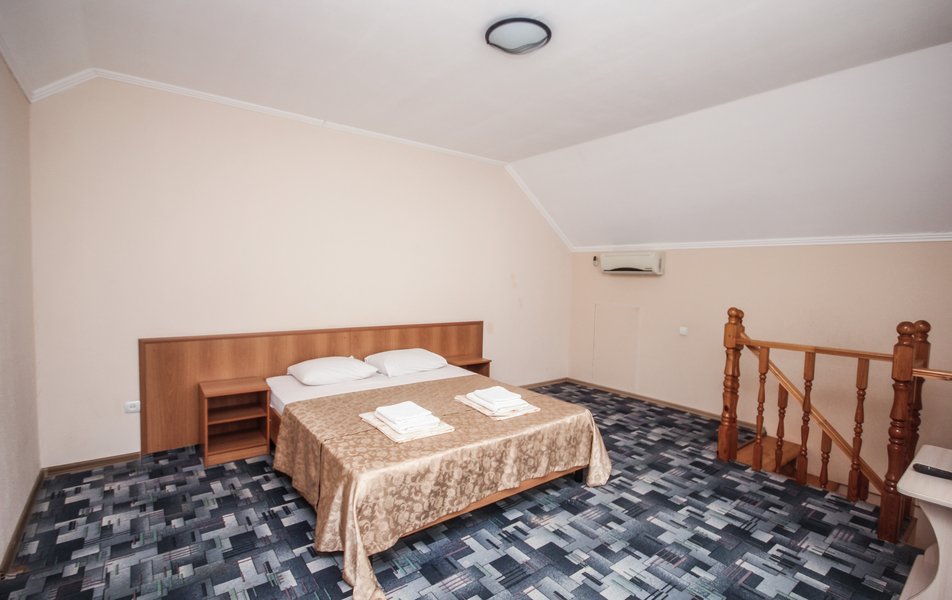 Двухэтажный люкс включает спальню, гостиную, ванную комнату с душем. В комплектации кондиционер, мини-холодильник, телевизор, Wi-Fi, туалетно-косметические принадлежности, фен. Гости размещаются на двуспальной кровати и диване.