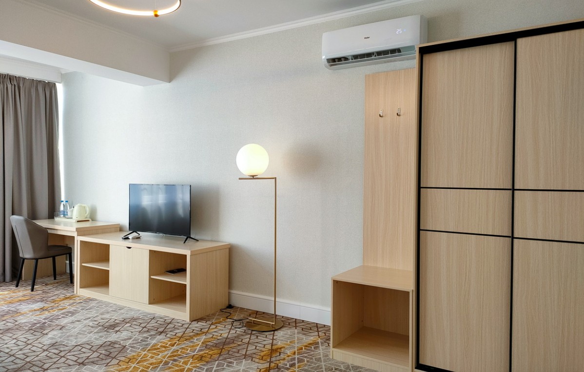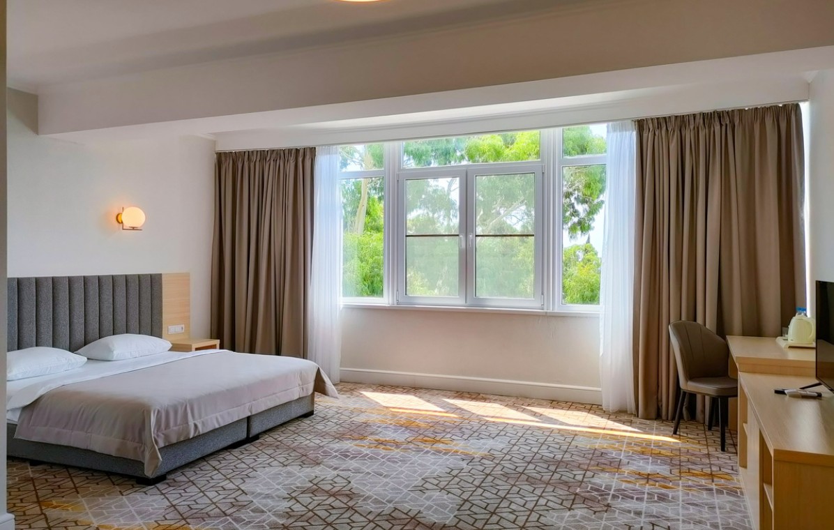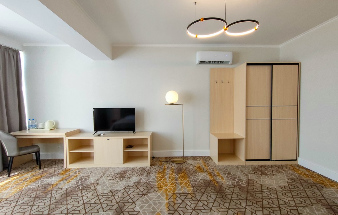 Номер без балкона со спальней и ванной комнатой с душем. В числе удобств двуспальная кровать, Wi-Fi, мини-холодильник, кондиционер, сейф, телевизор, фен, наборы косметики, принадлежности для приготовления чая и кофе. Напольное покрытие - ковролин.