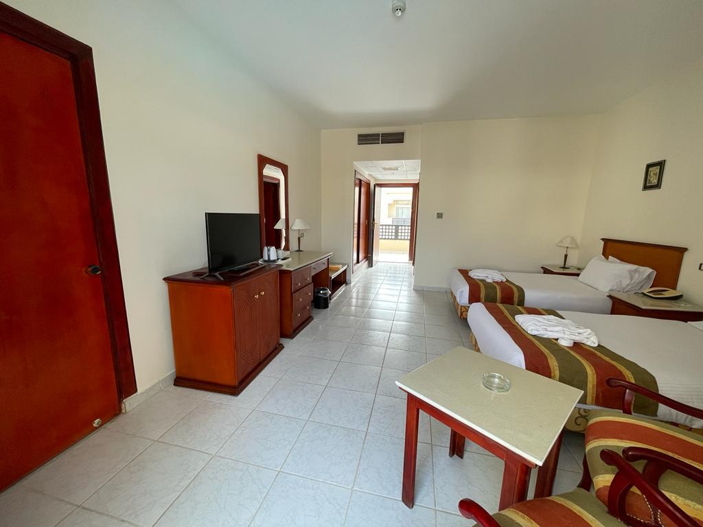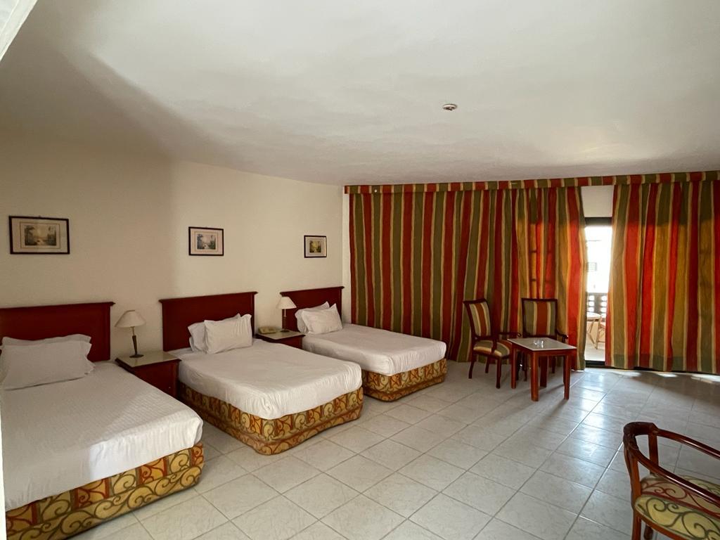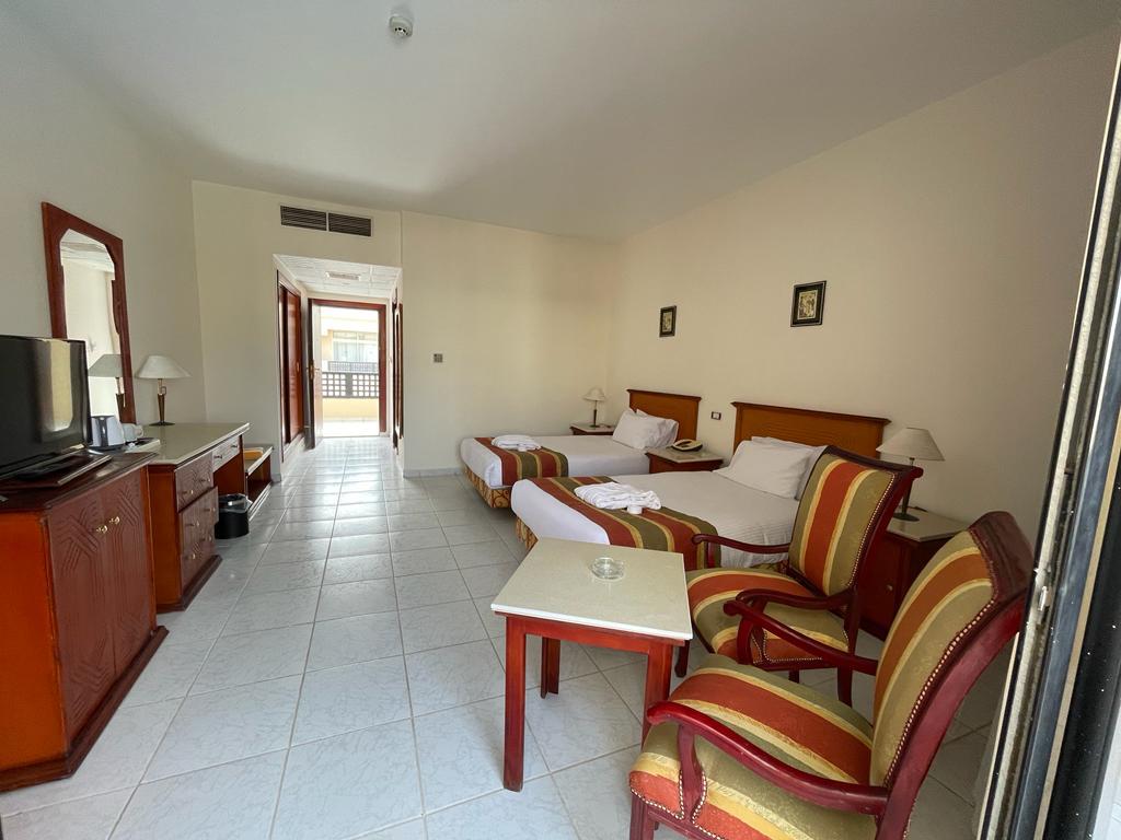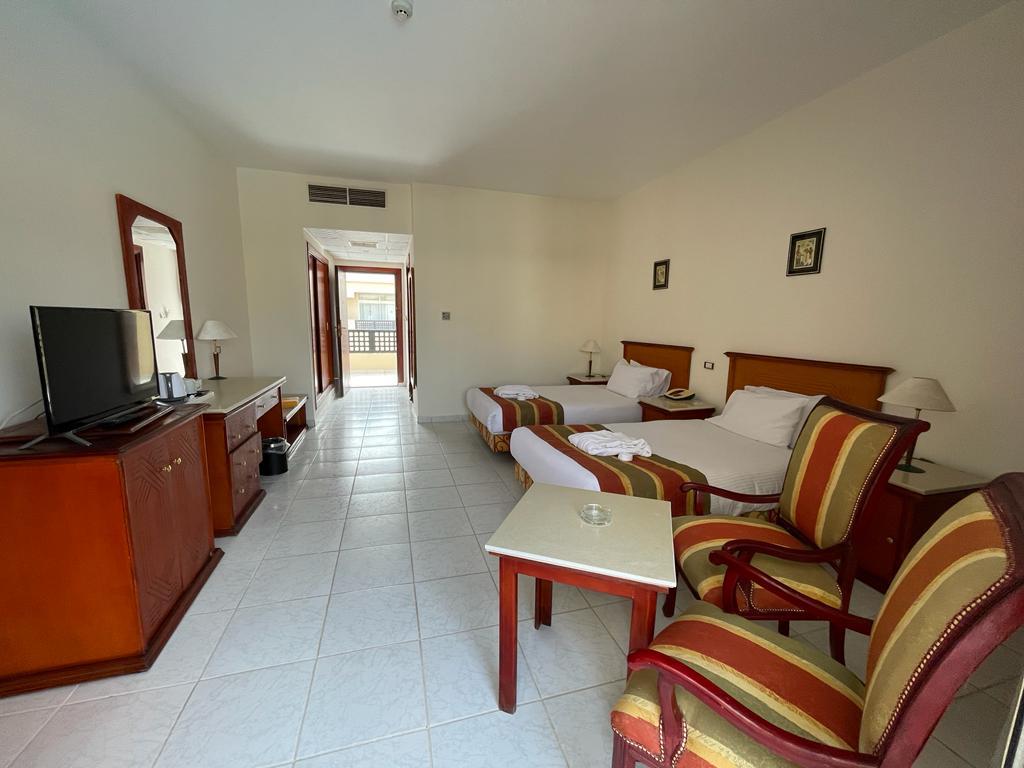 Отель хороший , все чисто , номера просторные ( возможно требуется обновить их ) но в целом это никак не влияет на качество отдыха . Ванна большая , балкон. Питание твердая 5; до пляжа нужно ехать на шаттле или пешком 12 минут по закрытой территории около отеля . На пляже свой огромный аквапарк ( очень много взрослых и детских горок) пляж песочек и кораллы , можно прямо без маски увидеть много рыбок , на пляже есть бар , соки конечно разводные (не советую )пляжные полотенца выдают , уборка номера каждый день , две бутылки воды в номер ставят . Персонал очень вежливый, доброжелательный . На территории отеля магазин - цены нормальные . Остались очень довольны отдыхом ! Ps не советуем кататься на верблюде на пляже ( стоит 15 долл с человека ! Считают даже маленького ребенка за полноценного человека ) - у туроператора брали экскурсию по Хургаде дневную - худшая трата времени , если ваша цель не магазины сувенировов и масла - отель предоставляет ланч боксы по просьбе заранее - были на ужине в отдельном ресторане ( оказался пляжный бар ) но в целом приятно , на пляже, вечер, обслуживание официант(остались довольны) еда плюс минус как и в обычном ресторане - вай фай работает плохо . У нас ловил только на улице - но для нас это был даже плюс ( провели время без новостей и лишней инфо )