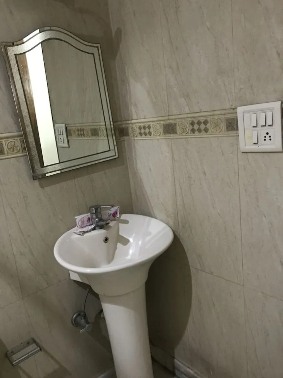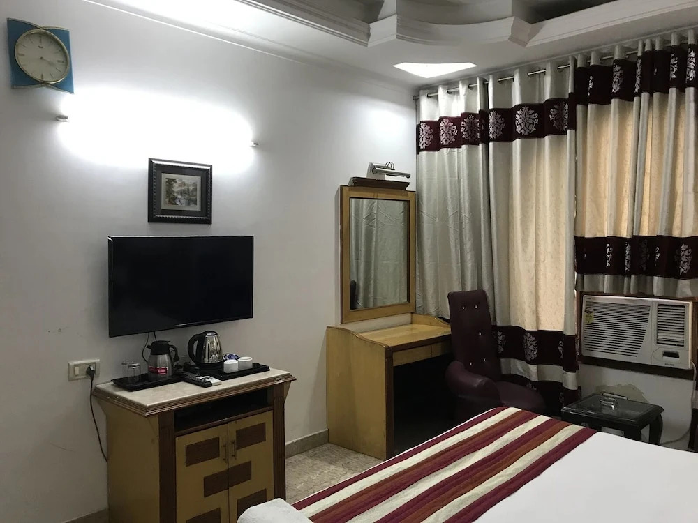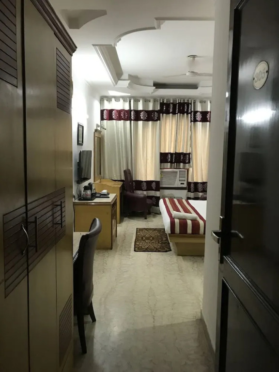 Мы остановились здесь на 2 ночи (3 женщины) в начале нашей поездки в Индию. В отеле были лучшие дни, ванные комнаты грязные, и горячей воды не было. В номерах очень сильно пахло нафталинами. Персонал не был особенно дружелюбным. Отель находится на тускло освещенной боковой дороге, ведущей к оживленной главной дороге. Он находится в нескольких минутах ходьбы от уличного рынка (где мы купили подушки, так как в отеле были грязные). Телевизор в приемной был включен ночью и был очень громким. Мы не останемся здесь agsin