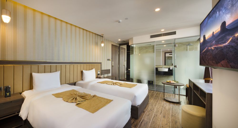 Комфортабельный номер с двуспальной/2 раздельными кроватями, ванной комнатой с душем, есть номера с балконом. В числе удобств - чайный набор, телефон, телевизор, сейф, мини-бар, кондиционер беспроводной интернет, фен. Предоставляются тапочки, халаты, гостиничная косметика. Из номера открывается вид на город/частично на море.